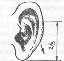 1. Начинайте процедуру с 2/3 высоты уха по направлению к мочке; пощипывайте край по периметру, а потом подкладывайте под мочку указательный палец и слегка поглаживайте мочку (рис.).